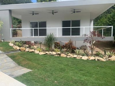 We have four beautifully designed houses on the Aves property. Each house is built to the highest of standards with features such as an outdoor double head sky shower, green flat roofs, large outdoor decks, kitchenette, king sized bed, queen sized sofa sleeper, a/c, WiFi, TV, safebox, and welcoming views of the lounge pool and jungle.